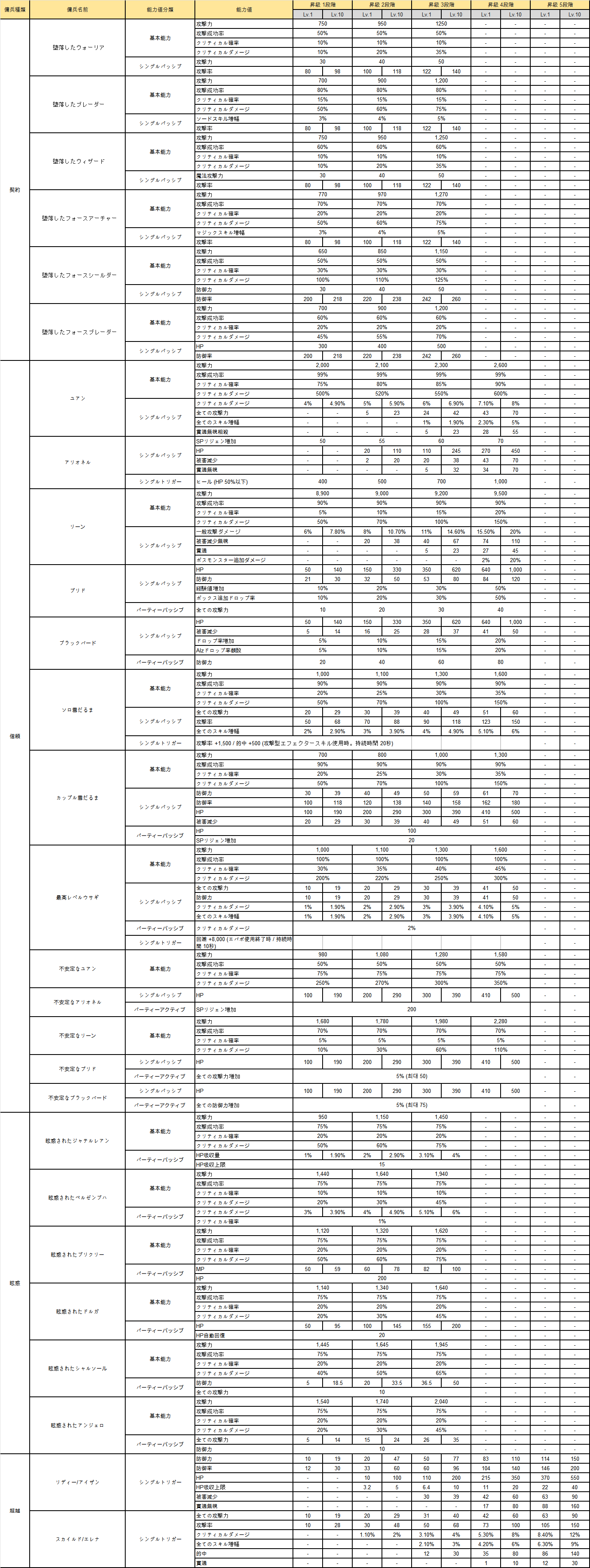 ■ 傭兵リニューアル 1. 傭兵 UI リニューアル 2.傭兵強化及び昇級追加 ●強化 A.全ての傭兵は各段階別に10レベルまで強化可能 B.強化成功時レベル1増加及び能力値増加、失敗時レベル維持 C.強化費用及び確率 ● 昇級 A. 強化10レベル達成時、100%の確率で次の段階に昇級可能 B. 傭兵の種類ごとに最大昇級段階が異なる i) 契約/幻惑傭兵 : 3段階 ii) 信頼傭兵 : 4段階 iii) 超越傭兵 : 5段階 C. 昇級時、修練の原石を消費 ● 総合傭兵能力値 3.親密度追加 ●傭兵を召喚する場合、10秒ごと(10秒未満は捨てられる)1ポイントずつ傭兵との親密度が増加 ●親密度は傭兵召喚を解除するタイミングで増加 ●傭兵の親密度はグループ化されており、同じグループ内の傭兵は親密度を共有 ●獲得した親密度に応じて段階が増加し、合計5段階まで存在 ※傭兵支援効果は傭兵を召喚しなくてもキャラクターに適用される永久持続効果 ● 親密度 段階に応じて「傭兵の支援効果」適用 A. 傭兵の支援効果 i) キャラクターに永続的に適用される能力値で、傭兵を召喚していない状態でも適用 ii) 該当傭兵グループ内に傭兵1体だけ登録しても効果適用 iii) 同じグループ内の傭兵が何体登録されていても関係なく、親密度 段階に応じてのみ固定された数値で適用 B.傭兵グループ別支援効果 4.傭兵共通変更 ●全ての傭兵の召喚可能なキャラクターレベルを100に統一 ●全ての傭兵の召喚維持時間を既存の15分から10分に短縮 5.信頼 - イベント傭兵関連変更 ●[イベント - 〇〇]形態の名前を[不安定な〇〇]に変更 ●不安定なユアン/アリオネル/リーン/プリド/ブラックバードの外見及びアイコン変更 6.契約の玉/眩惑の玉販売追加 ●販売NPC変更:リモートショップとブラッディアイスの雑貨商人 ●販売金額変更 A.契約の玉:700万Azl + 300AP B.眩惑の玉:700万Azl + 20DP ●購入制限追加:各ショップ毎に週10回まで購入可能 ●帰属属性追加:アカウント移動不可 7.アルティメットブースターアイテムの特典に「傭兵召喚制限解除」を追加 ●傭兵を同時召喚できる特典で、最大4名まで同時召喚可能 新規業績追加 ※超越傭兵の場合、傭兵解除時に関連業績が未達成処理され、称号が満了する(再登録時に条件に合う業績達成および称号が支給される)
